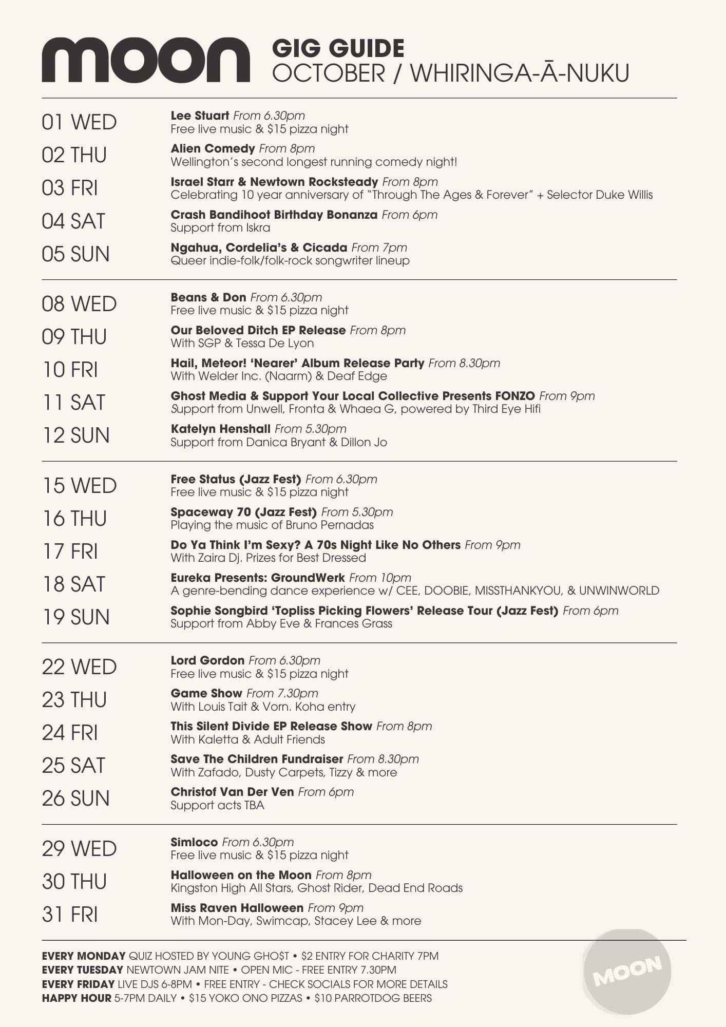 Celebrate local talent and support your midweek mood with Free Music Wednesdays at Moon. Handpicked live acts + pizza deals that hit the spot. Free entry, warm vibes—see who’s playing this week on our Facebook.