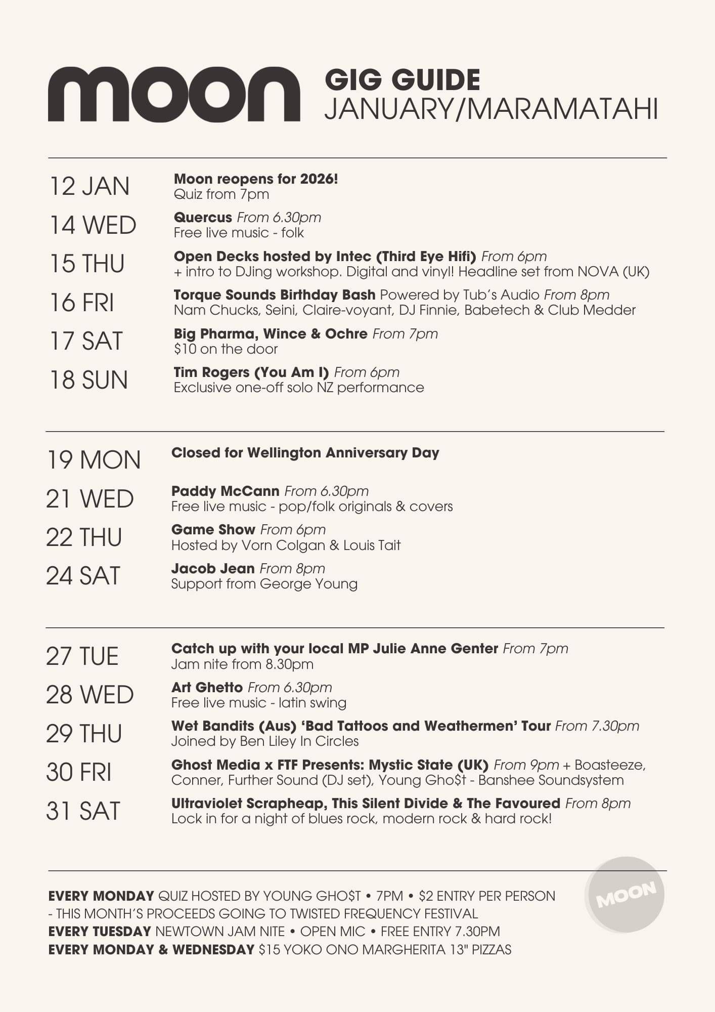 In the heart of Newtown, Moon offers some of the best hand crafted pizza in Wellington and pours beer from New Zealand's top craft beer breweries. Moon showcases the diversity of local, national and international music that this beautiful world has to offer. With a grassroots approach and an emphasis on inclusivity and respect, Moon has provided a cultural haven for Wellington live music lovers, party animals, late night schmoozers, after work chillouts and local Newtowners for the past 10 years.